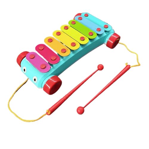 Um brinquedo menino de 1 ano com rodas com a possibilidade de puxá-lo como um carrinho. Assim, como tocar as teclas coloridas para explorar sons e ritmos.