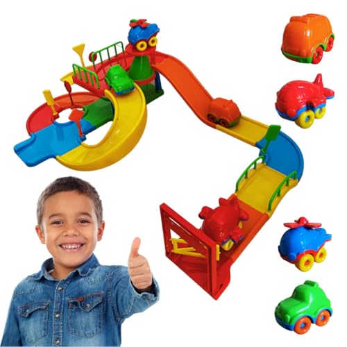 Brinquedos para crianças de 1 ano menino que inclui 6 mini carrinhos que descem por rampas coloridas. Esse brinquedo pode estimular a coordenação motora e a criança acompanhar o movimento dos carrinhos pelas rampas.