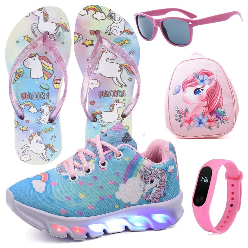 O kit inclui tênis com luzes LED na sola, mochila, chinelo, óculos e relógio, uma combinação prática e divertida como presentes de dia das crianças para meninas. A menina pode explorar diferentes acessórios e brincar com diferentes estilos.