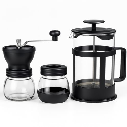 Sugestão de presente para sogros que gostam de café. Contudo, o kit vem com moedor manual ajustável e pote extra para grãos ou pó, além da cafeteira.