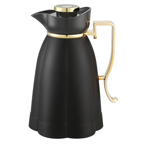 A garrafa térmica possui 1 litro e detalhes dourados elegantes. Ao passo que mantém a temperatura do café, serve como um presente criativo para quem ama café funcional.