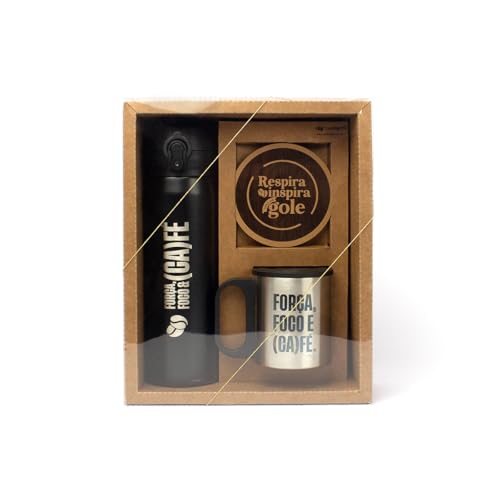 Esse presente para quem gosta de café personalizado inclui garrafa térmica prática, caneca em inox e porta copo em MDF.