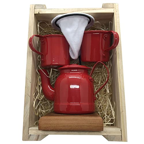 O kit artesanal possui caixa de madeira, coador de pano, 2 canequinhas e um bule. Em seguida, agrega charme e organização, tornando-se um kit cafe presente especial.
